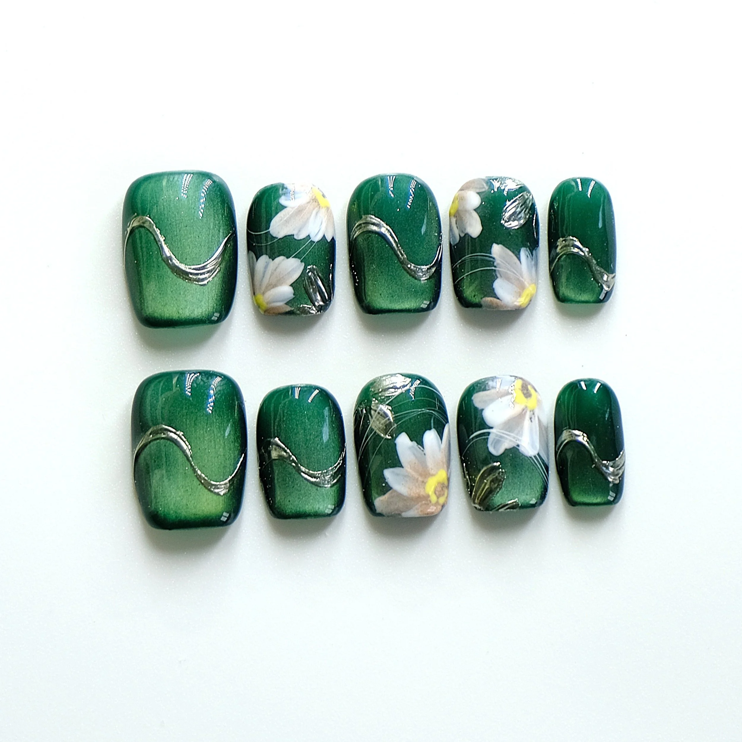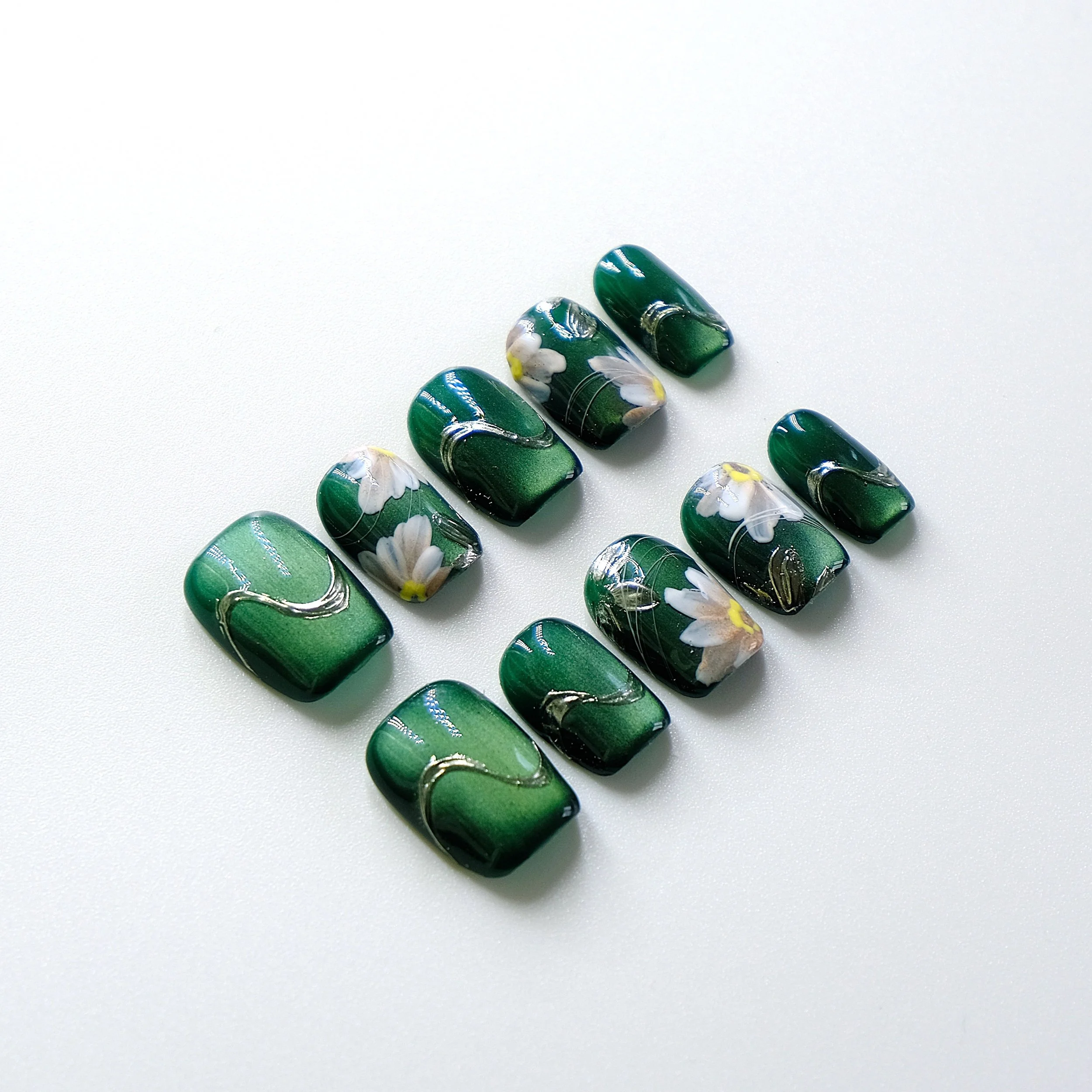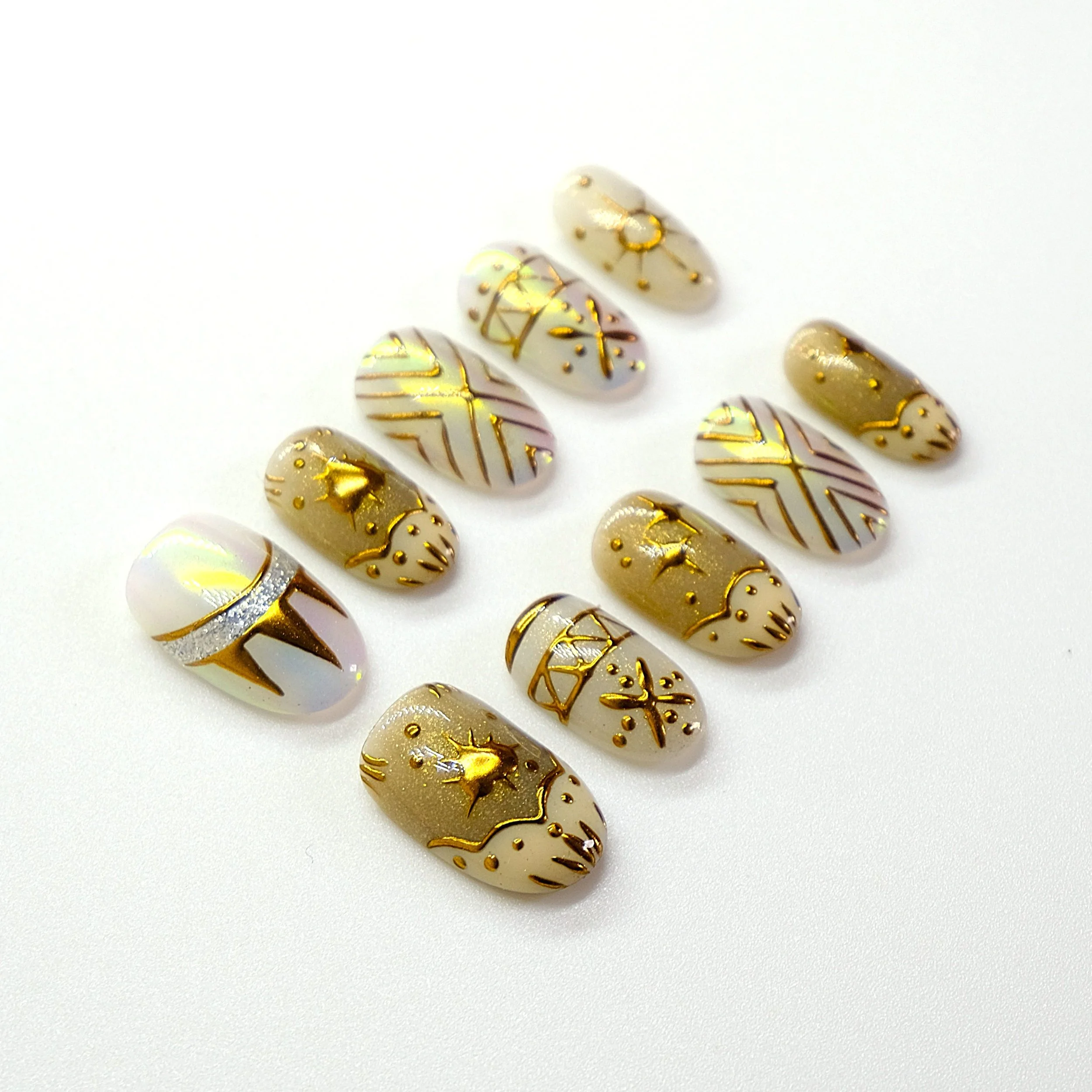 Chaque ongle est une ode à la beauté éphémère, un reflet subtil du temps qui passe et des instants précieux figés dans un éclat doré. Portés du bout des doigts, ces motifs floraux entrelacés de fils lumineux racontent une histoire de douceur et d’élégance discrète.