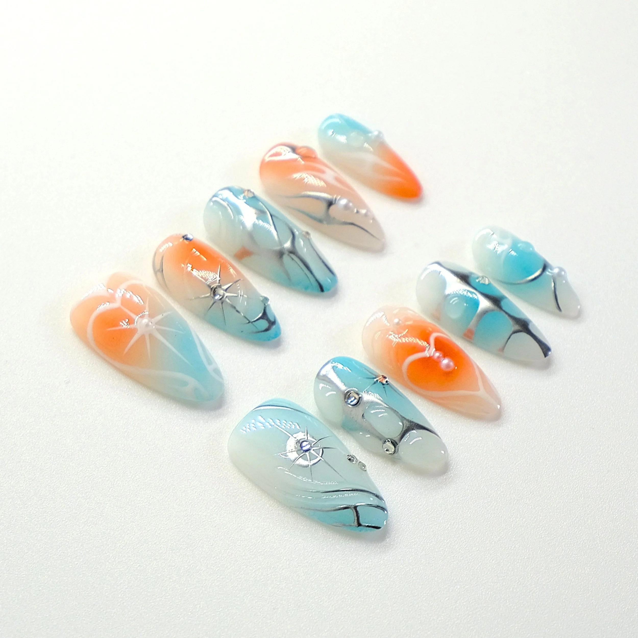 Découvrez Soie Impériale, un design inspiré par la richesse et l'élégance de l'Asie traditionnelle. Avec une base nude subtilement douce, chaque ongle est orné de délicates sculptures argentées, évoquant la finesse de la soie et l'artisanat asiatique. Ce style raffiné et moderne incarne la beauté intemporelle de l'Orient, alliant simplicité et luxe. Ces faux ongles apporteront une touche sophistiquée et délicate à vos mains, pour un look chic et gracieux.